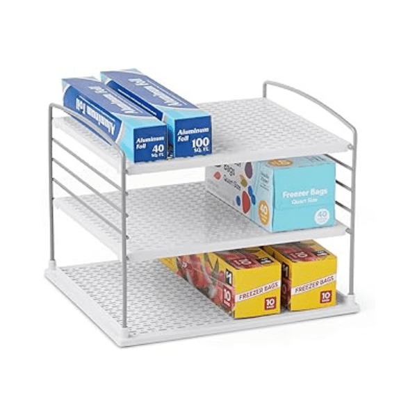 Create additional storage space in your cabinets with this expandable kitchen cabinet shelf, allowing you to organize dishes, cups, and more efficiently.